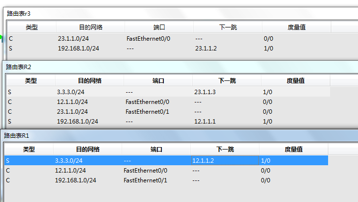 R3:目的IP:PC地址 下一跳R2 F0/1