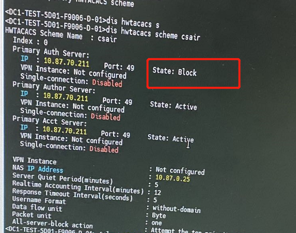 2台F9006防火墙做堆叠,客户反馈:AAA认证、授权、计费,其中一个认证跑到了备框上,另外2个授权、认证在主框上,上面state状态显示Block静默状态,导致telnet不了,配置了:session synchronization enable。