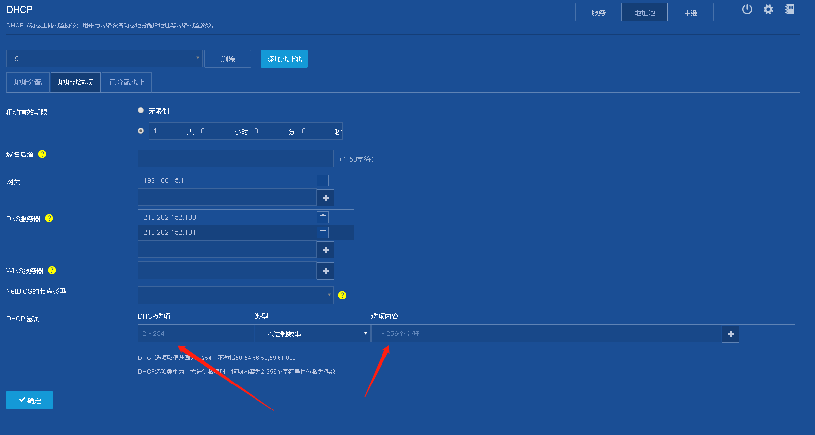 现有s5120v2交换机一台,已经开启web界面,划分vlan,开通dhcp,在正常使用阶段,现valn15的dhcp服务有所变动计划从192.168.15.80-254,现在,在交换机web界面的地址池选项=里的dhcp选项怎么填写? 忘大神帮忙解决,谢谢。(我在dhcp选项里怎么填写也是错误的)