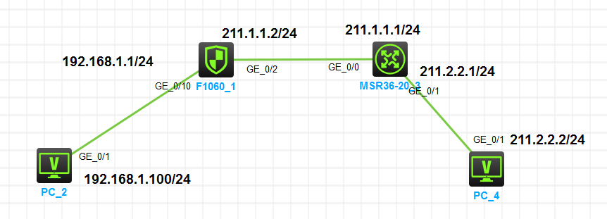 目的很简单只是想让可信区域的PC2可以访问不可信区域的PC4,但是在做了上述配置后,从防火墙可以ping通左右两侧各个IP,pc2可以ping通到211.1.1.2,1.1的就Ping不通了,请问这是因为什么呢?