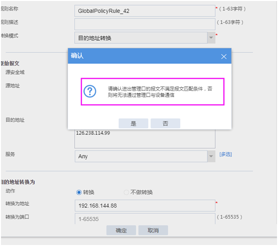 F100-C-G5防火墙 NAT策略配置, 目的地址转换, 内网地址 192.168.144.88 对应公网地址 126.238.114.99 ,转换之后出现提示:请确认进出管理口的报文不满足报文匹配条件,否则将无法通过管理口与设备通信 。我用的也不是管理口,这个和管理口应该没关系,怎么会出现这个提示,这个提示是啥意思?