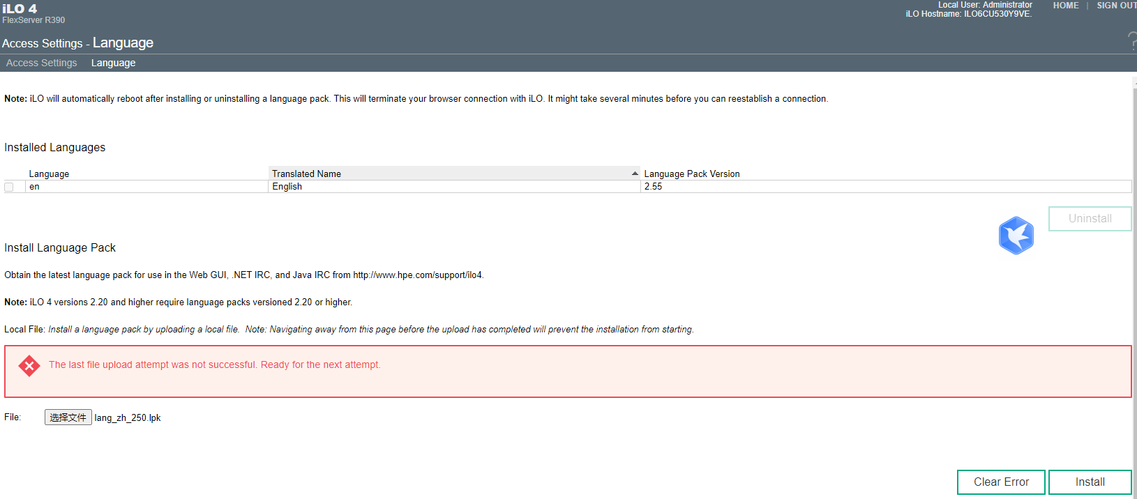 有2台 服务器都是 装的vmware ESxi系统 iLO 4 都已经将固件版本升级到 2.55 语言包用的 lang_zh_250.lpk 一台正常安装了语言包 另外一台报错 :