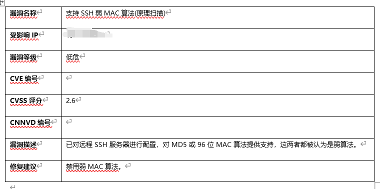 目标主机SSH服务存在SHA-1、96位MAC弱加密算法,SSH弱加密算法可能会导致认证信息被窃听、破解。