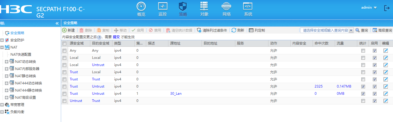 然后建立安全策略,从Trust到Untrust,源地址Lan30,允许