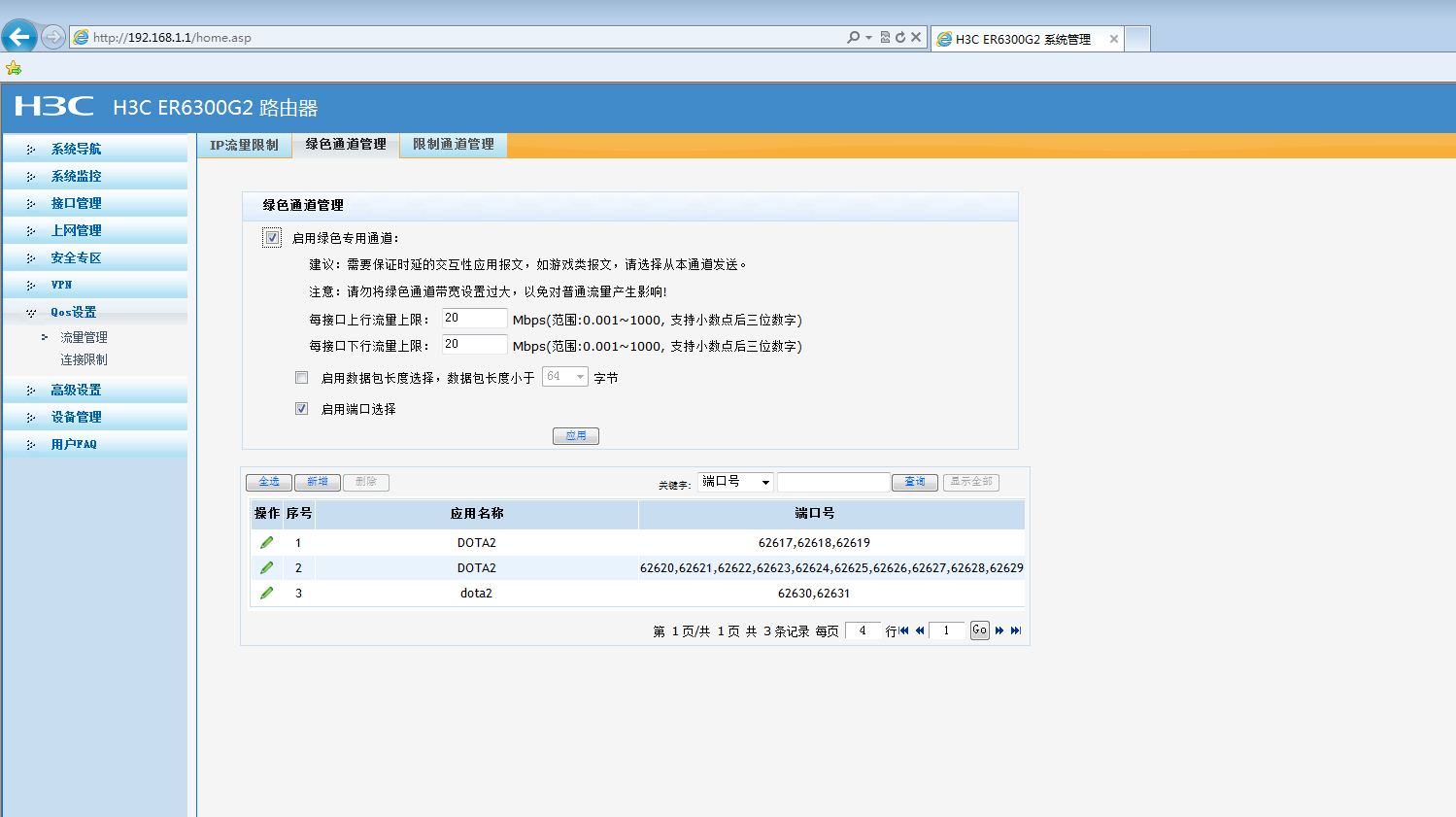 设置就是开启绿色通道,设置上下行流量限值,在端口里添加需要加速的游戏应用的服务端口号,建议先确认清楚端口是不是写对了,游戏服务器应用到的端口自己百度搜一下