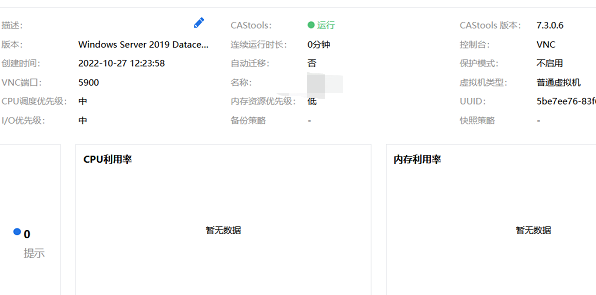 看截图虚拟机运行时长0分钟,那就是才启动,没有显示利用率是正常的,这里的算法还是取连续时间点的数据平均值;现在虚拟机连续运行一段时间了吧,如果这时候还不显示利用率就不正常了,看下这篇云图排查下:https://zhiliao.h3c.com/Theme/Chart/1232