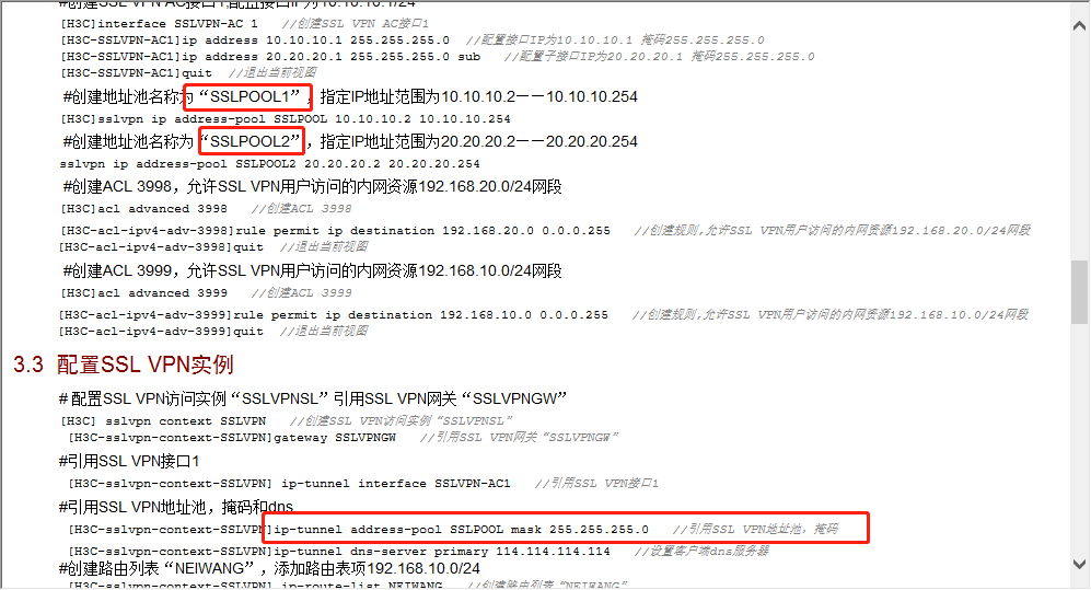 新建了两个用户地址池,但下面 配置SSL VPN实例 的时候只引用了一个地址池