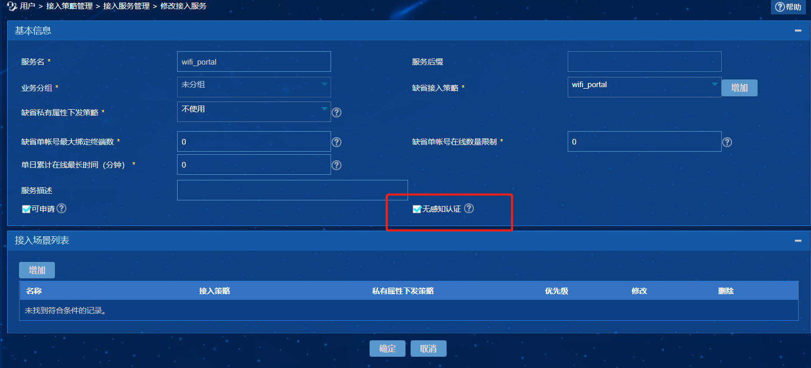 (1)用户-接入策略管理-接入服务管理,勾选“无感知认证”;