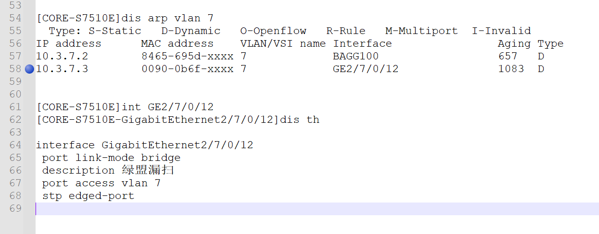 核心交换机上接了一台漏扫设备,核心接口划了vlan7,配了边缘端口。
