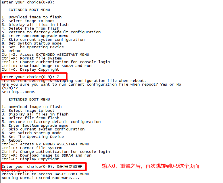 交换机console密码忘记了,ssh,telent没有打开,插电之后按Ctrt+B进入恢复密码页面,之后无法退出重启,一直在循环让输入0-9,应该怎么退出,判断是否修改成功