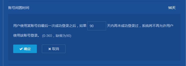 缺省情况下,用户帐号的闲置时间为90天。