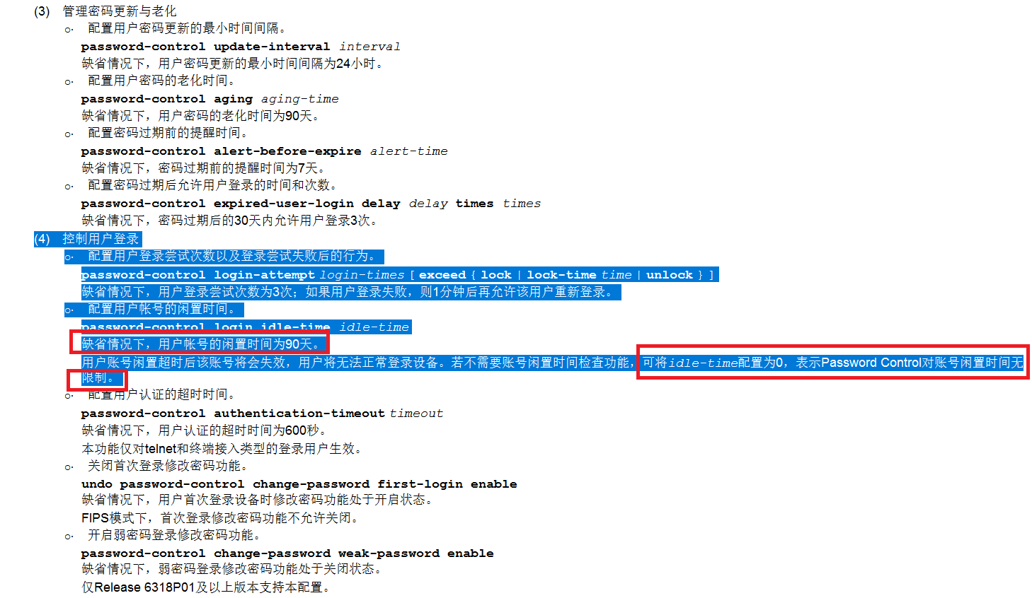 用户账号闲置超时后该账号将会失效,用户将无法正常登录设备。若不需要账号闲置时间检查功能,可将idle-time配置为0,表示Password Control对账号闲置时间无限制。
