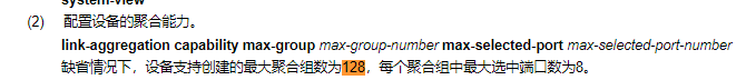 缺省情况下,设备支持创建的最大聚合组数为128,每个聚合组中最大选中端口数为8。