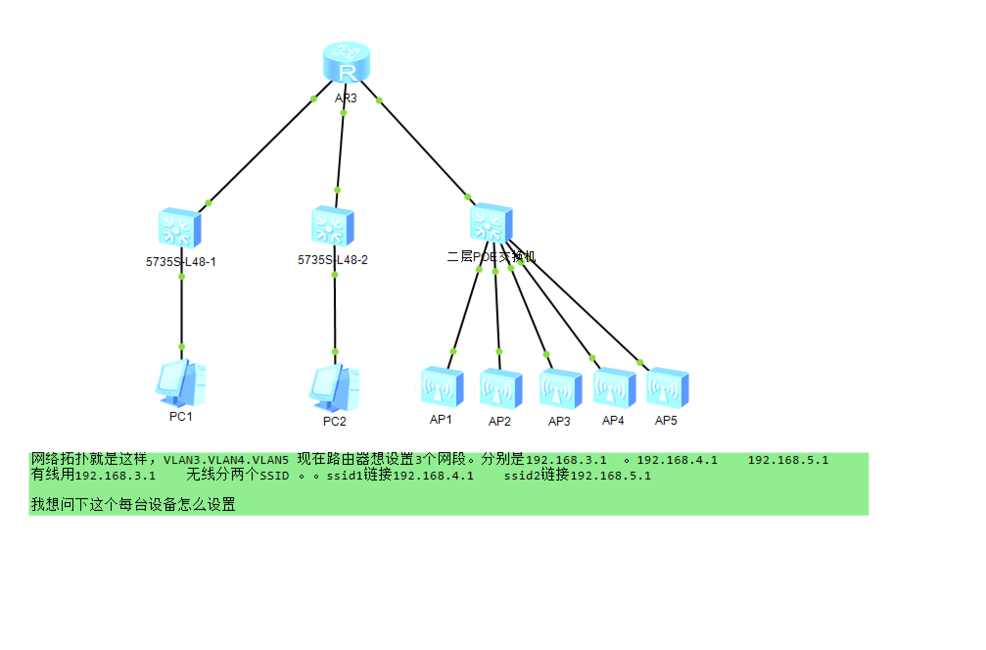 网络拓扑就是这样,VLAN3.VLAN4.VLAN5 现在路由器想设置3个网段。分别是192.168.3.1 。192.168.4.1 192.168.5.1 有线用192.168.3.1 无线分两个SSID 。。ssid1链接192.168.4.1 ssid2链接192.168.5.1 我想问下这个每台设备怎么设置