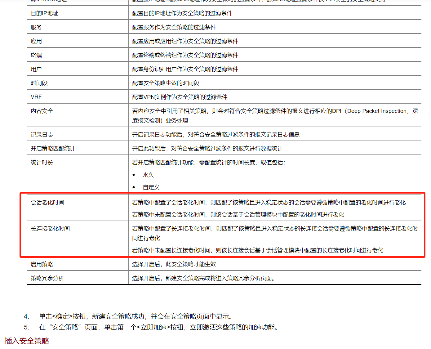 会话老化和长连接老化是基于协议的,系统默认有会话老化时间,不同协议老化时间不同,可以通过配置长连接的方式去增加某些协议的会话老化时间。