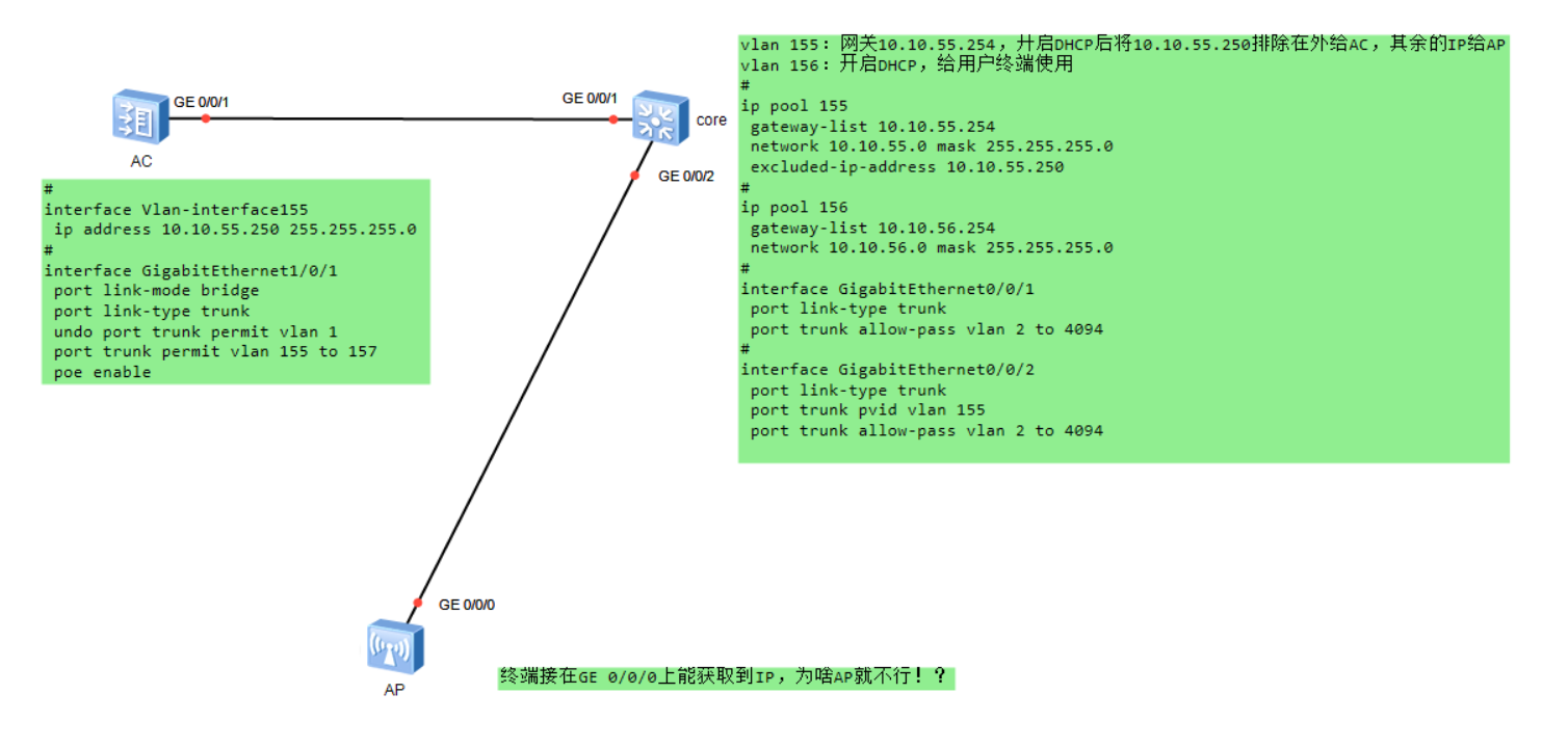 AP上联设置的是trunk口,缺省vlan为AP的管理vlan,接有线终端也能获取到地址池的地址。AP型号是W4320-ACN-E-FIT,瘦模式下工作,AP不管怎么样都获取不到IP