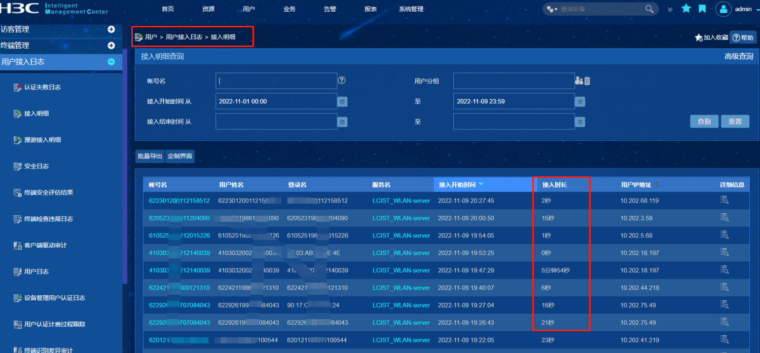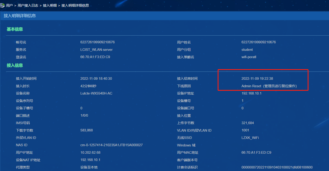 同时检查IMC接入明细时发现终端下线原因都是管理员复位操作。