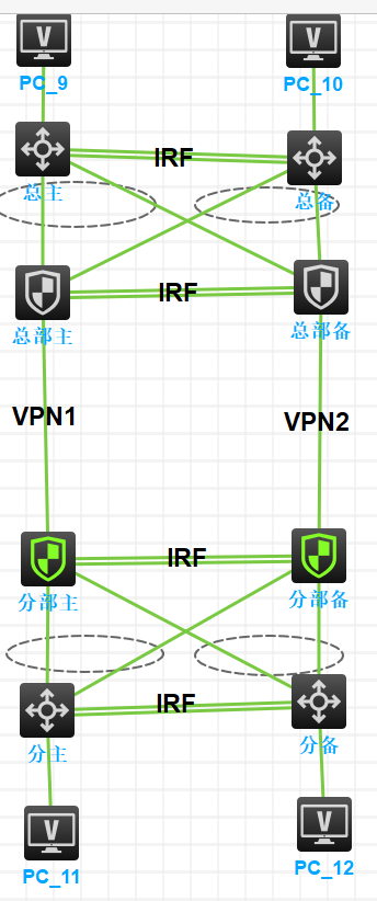 组网需求如下:总部两台防火墙做堆叠,分部两台防护墙做堆叠,现在总部有两条互联网专线,分部有两条互联网专线。准备一主一备,两边主专线做VPN通道,备专线也做vpn通道,想法是两边主的线路不通可以切换到备的线路,模拟的组网结构如下: