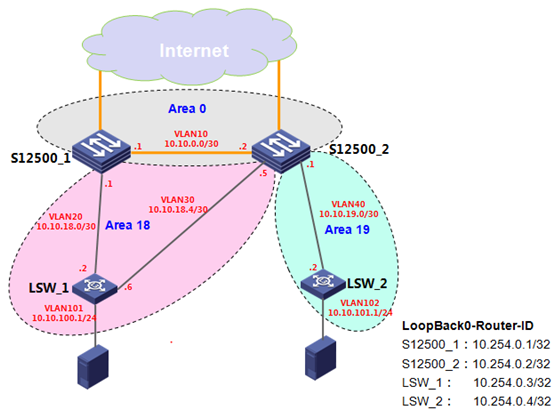 OSPF最佳实践配置的目的并不是提供最优的OSPF规划方案,而是结合S12500交换机的特点以及OSPF协议的实现,为提高OSPF网络在实际运行中的安全性、稳定性与可靠性所给出的配置建议。所涉及特性主要包括如下几点: