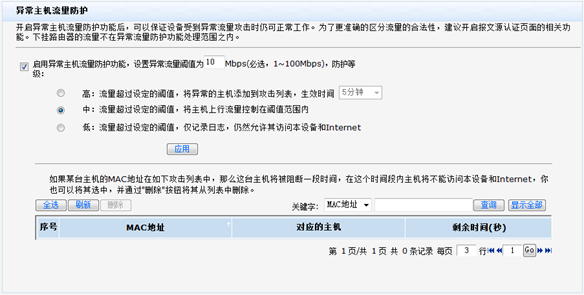 选择防护等级来对异常主机流量进行防护(选中“启用异常主机流量防护功能”复选框,并选择相应的防护等级,单击<应用>按钮生效) |
