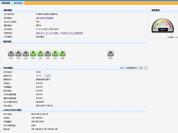 GR1108-P系统管理 纯AC模式 3个AP 其中LAN 4接上级路由器, lan5,7,8接入AP 时 端口的速度