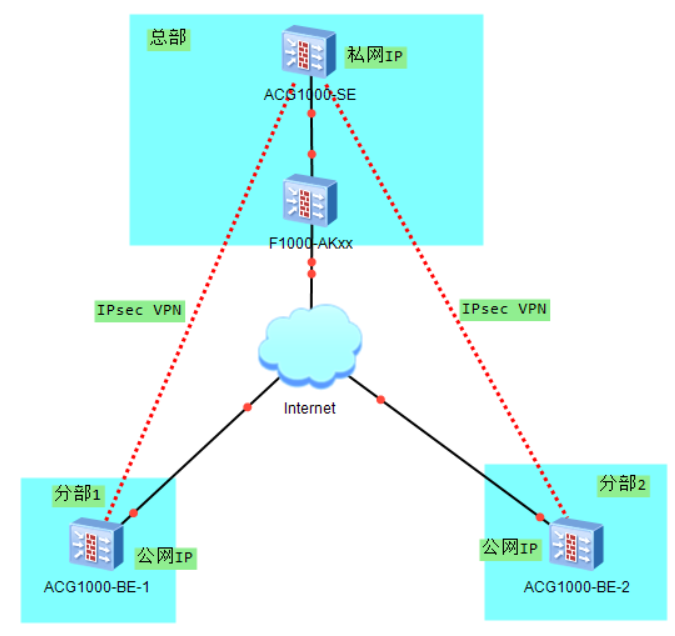 总部ACG1000-SE处于内网只有私网IP地址;分支机构为ACG1000-BE直连公网有公网IP地址
