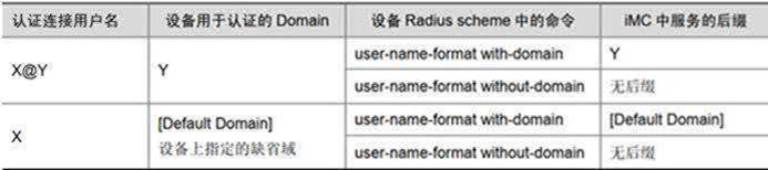 该报错基本都是设备上的radius服务器的domain域配置和iMC侧的接入服务后缀配置不一致导致,具体关系参见表格