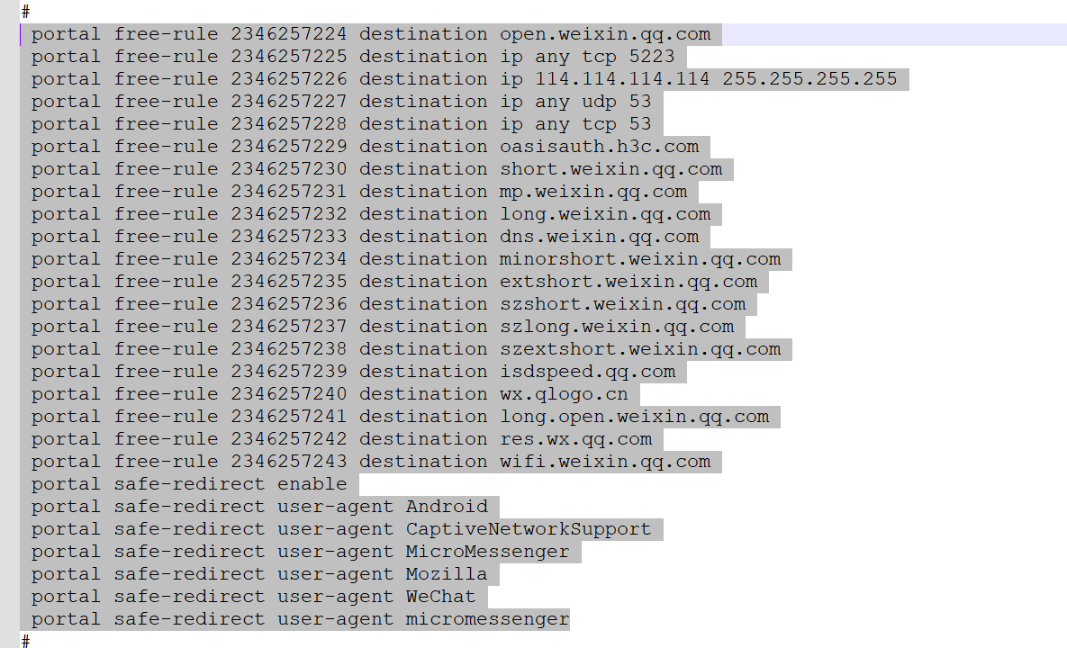 云简公有云固定账号认证未认证前就能使用微信,客户要求必须认证通过后才能使用微信,看到自动下发的免认证配置中有很多微信qq相关的域名