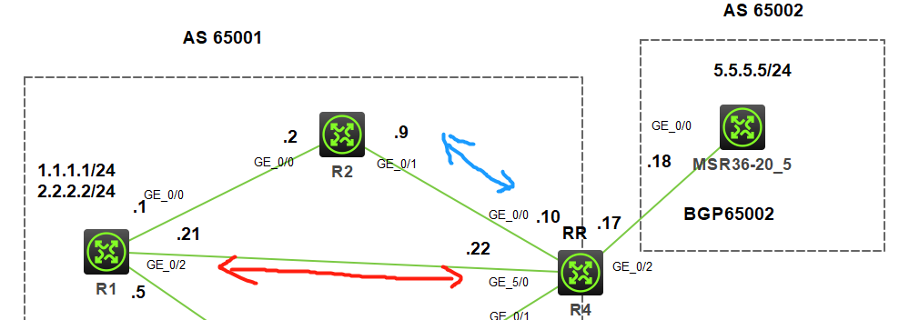 要求:一般情况下BGP走R1-R4(红色),当R1-R4链路故障,BGP走R1-R2-R4(蓝色)。