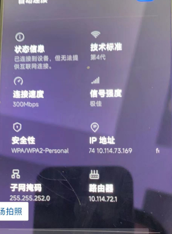 某学校通过通过华三AP释放内网信号,经本地转发,有固定的密码,无线手机终端可以关联上改信号,可以正常获取有效的IP地址,但是显示已连接到该设备,无法提供互联网连接。该热点的组网是移动汇聚交换机一个端口直连学校内网交换。在汇聚交换机上配置有地址池。现场测试发下电脑可以正常关联该信号,可以正常上网,ping 分配的 10.114.72.1网关正常。但是手机不行。
