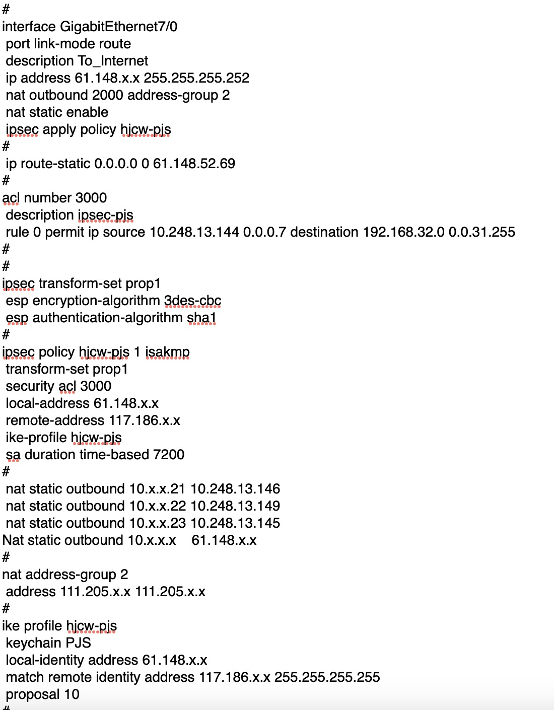出口路由器使用公网出口ip地址(61.148.x.x)与pjs机构通过ipsec-vpn业务进行通信,此条业务正常;现需要开通一条业务与zh机构进行通信,此业务需要通过static nat,即新增加了nat static outbound 私网ip 61.148.x.x。这时发现,新增加的业务没有问题,但ipsec-vpn给断了,同时公网ip无法ping通;把static nat去掉后,ipsec-vpn恢复正常。请问题这个现象是如何产生的呢?