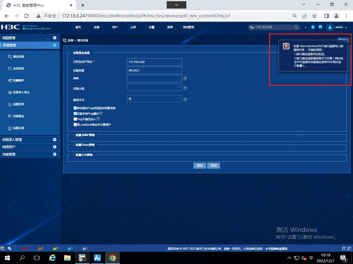 imc 管理平台添加华三无线控制器wx3540x 显示信息写入数据库失败是什么原因?