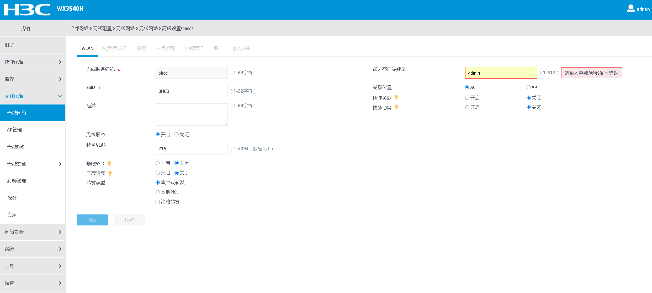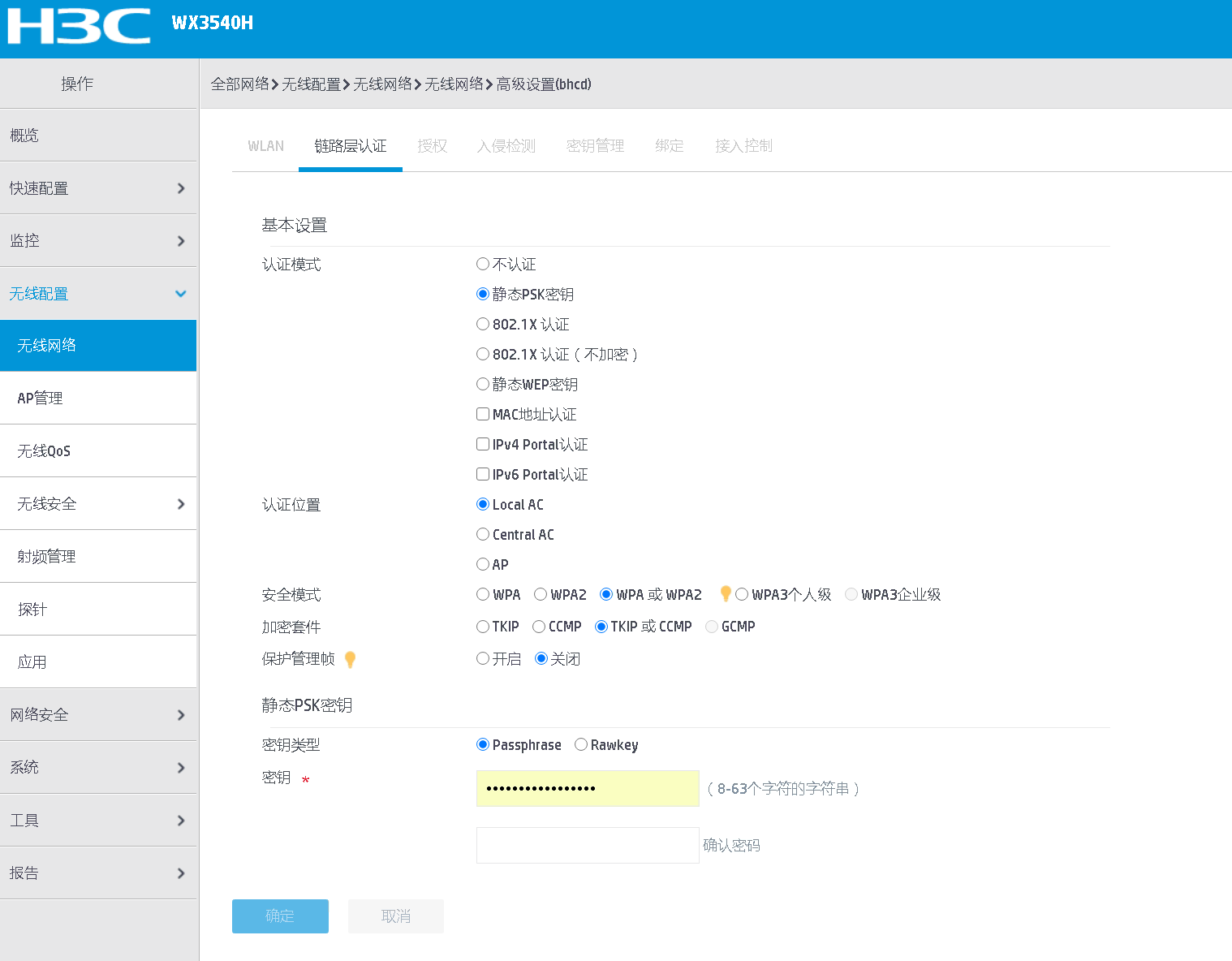 使用H3C WX3540H(Version 7.1.064, Release 5439P03)和WA6320、WA5630X组网,配置ssid如下