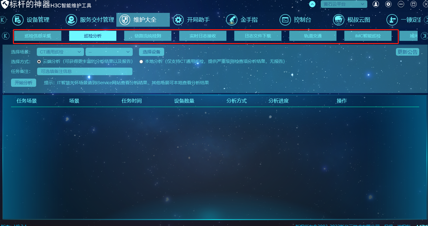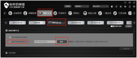 下图是标杆的神器目前界面,现在的界面没有诊断信息分析功能了,不能上传 诊断信息文件做分析了