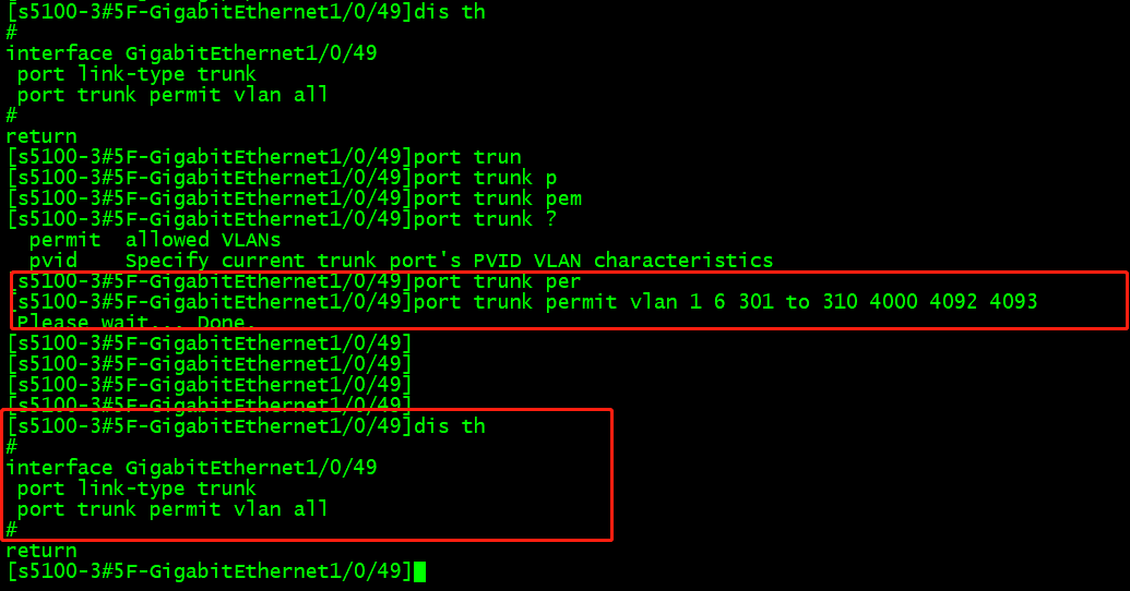 因为已经放通所有vlan了,所以再去放单独的tag,都是包含在内的。要么先undo permit vlan all,要么先修改为Access再修改为trunk,再去放通单个的vlan tag