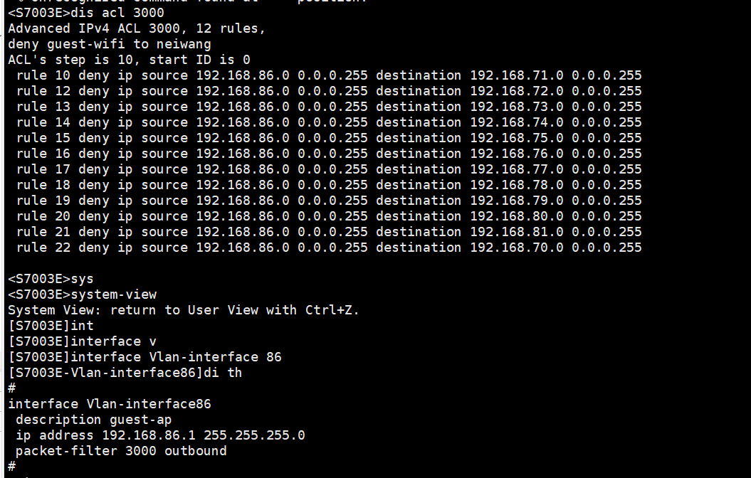 这是我在核心交换机上做的配置,但是目前看来还是不生效,请问是不是有其他问题没设置啊,无线访客WIFI还是能够访问公司任意内网业务