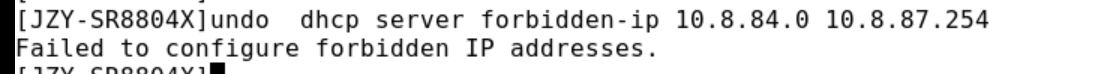 %Dec 6 15:00:44:575 2022 JZY-SR8804X SHELL/4/SHELL_CMD_EXECUTEFAIL: -User=admin-IPAddr=10.8.12.192; Command undo dhcp server forbidden-ip 1 0.8.84.0 10.8.87.254 in view system failed to be executed.