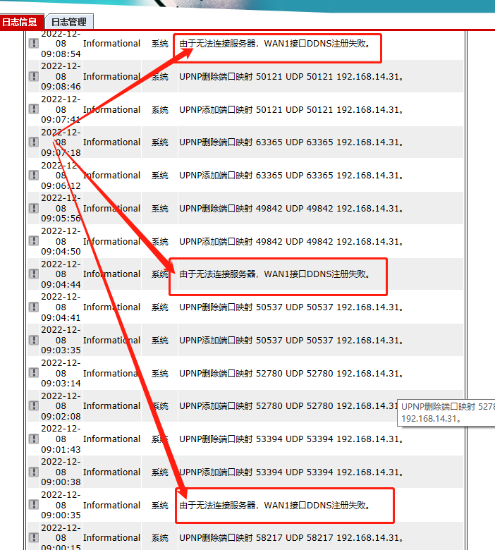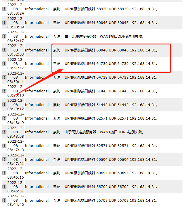 网络里一个192.168.14.31的ip持续操作upnp添加和删除端口,WAN口连接会中断。日志里查看不多其他用户异常登录,重启网关后日志被清除。