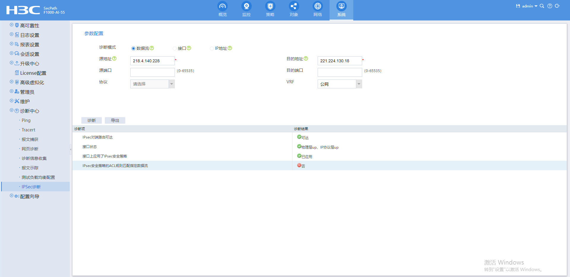 建立vpn的时候建立不起来,诊断的时候提示这个 ipsec 安全策略的acl规则匹配指定数据流,这个是哪里设置有问题?