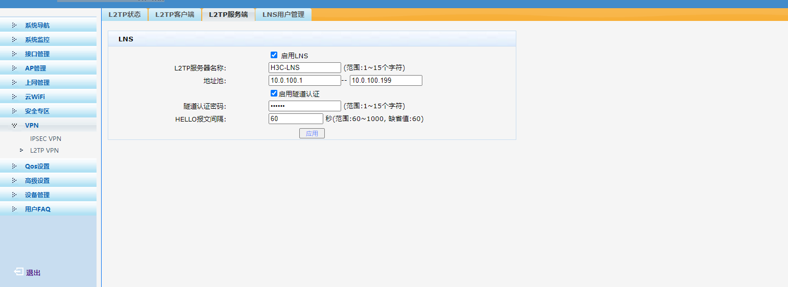 配置LNS信息(启用LNS,输入L2TP服务器名称:H3C-LNS,地址池:10.10.11.10~10.10.11.20,单击<应用>按钮生效) | |