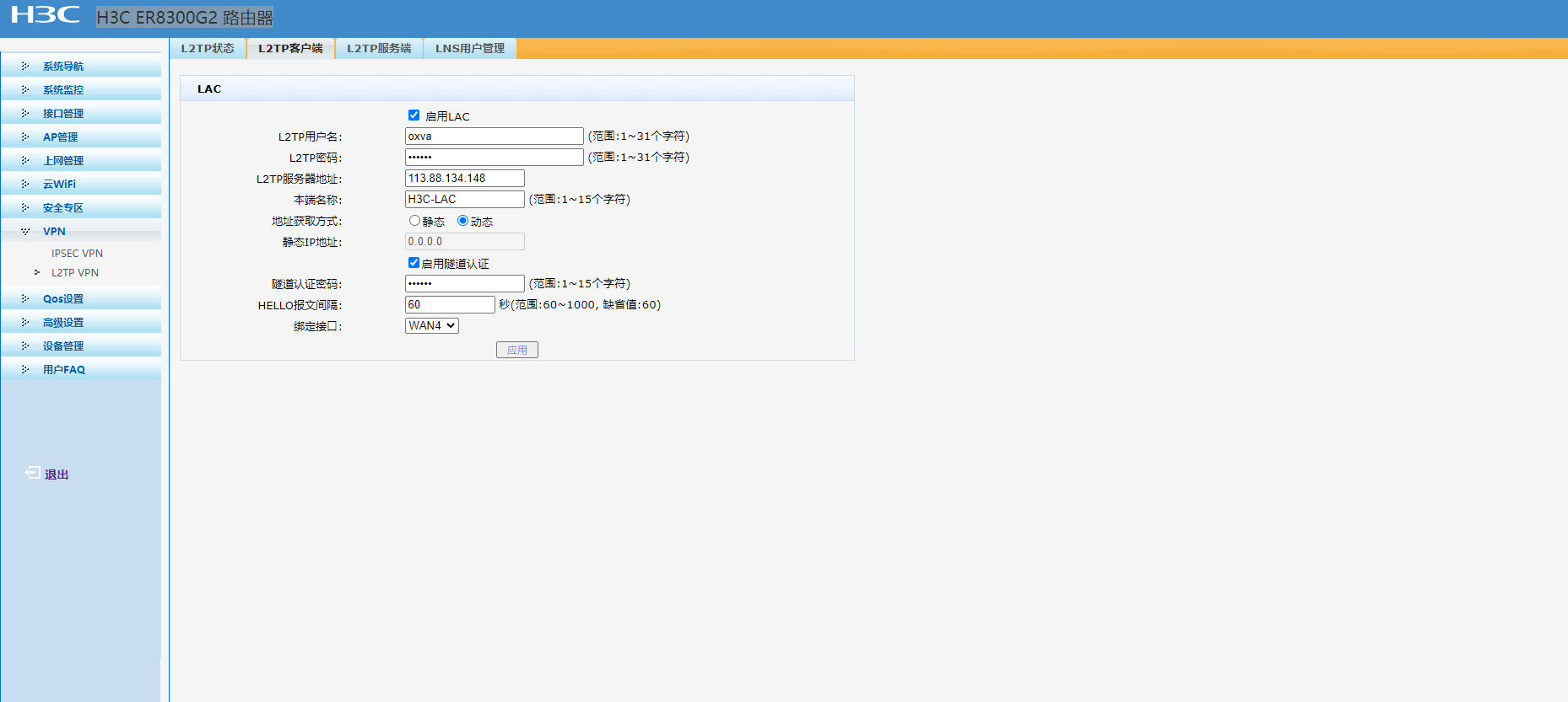 配置LAC信息(启用LAC功能,输入用户名:vpdnuser,密码:hello,L2TP服务器IP:192.16.100.31,地址方式选择动态获取,启用隧道认证,隧道认证密码:tunnel-auth,单击<应用>按钮后发起L2TP连接请求) | |