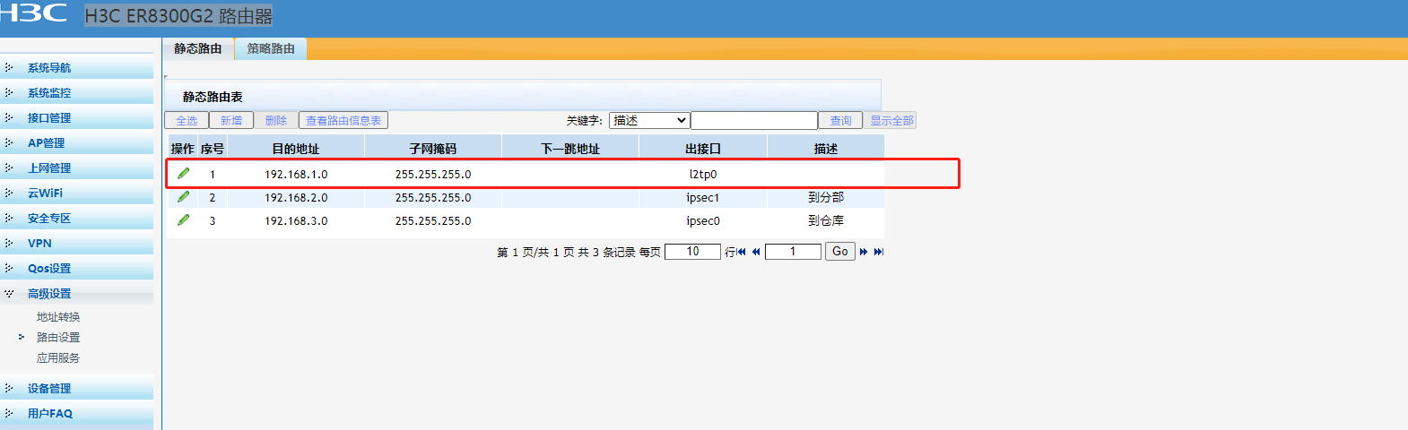 配置静态路由(设置目的地址为L2TP VPN对端网段地址,出接口为L2TP VPN虚接口,单击<增加>按钮生效) |