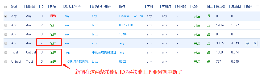 如图,新增两条策略后原ID为4策略涉及业务中断,将后两条策略删除后才能恢复