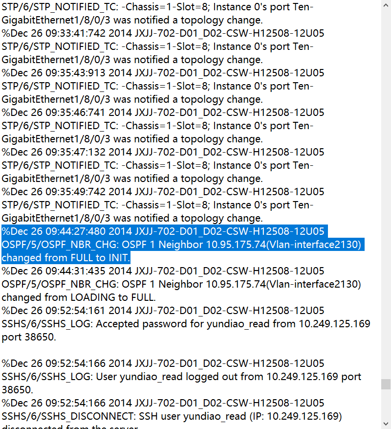你这个一看就是ospf邻居中断导致的。你注意下设备的时间跟网管上的时间是否一致。告警显示的是2014年12月26日。明显设备时间有问题。