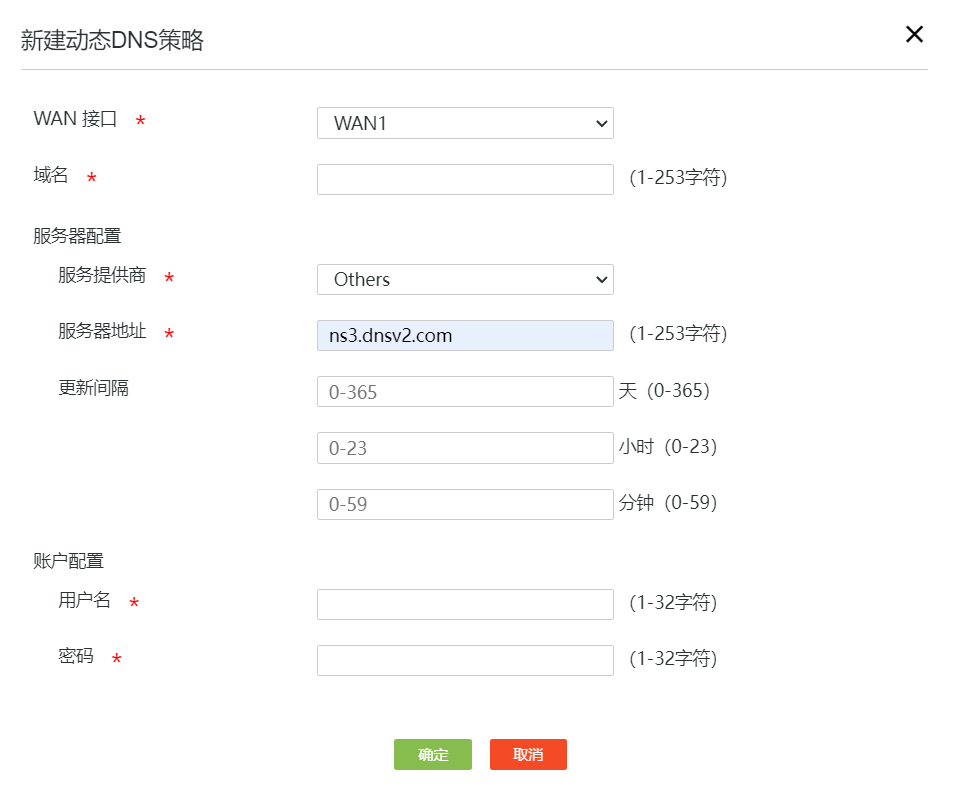 ¡ 更新间隔:设置设备向服务器发送更新请求的时间间隔。如果配置时间间隔为0,设备只在WAN接口IP地址发生变化或者接口连接由down变为up时发送更新请求。