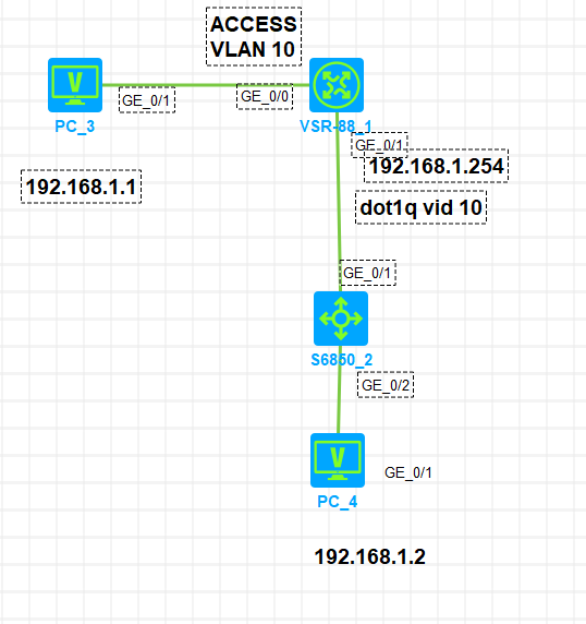 VSR-88是一台路由器 G0/1使用三层聚合口与下面交换机对接,并启用DOT1Q VLAN10 G0/0是二层口,透传VLAN 10 不明白为什么这样PC3不通网关