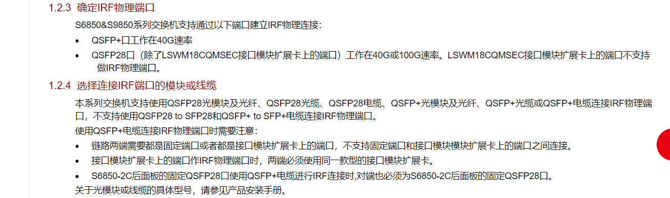 · QSFP28口(除了LSWM18CQMSEC接口模块扩展卡上的端口)工作在40G或100G速率。LSWM18CQMSEC接口模块扩展卡上的端口不支持做IRF物理端口。