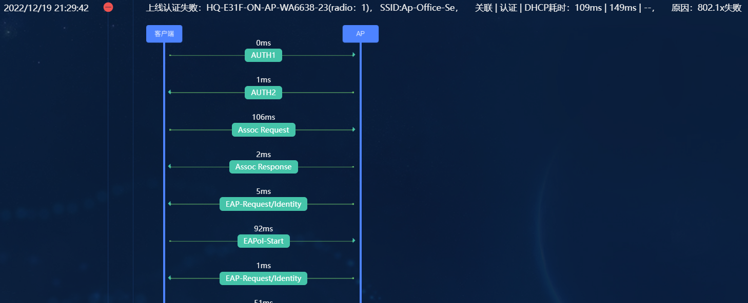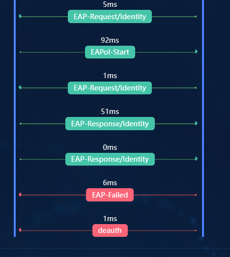 终端1x认证,上线失败显示发生过程终结在终端发送了身份信息之后AC直接返回终端1x认证失败,没有进行后续1x账号密码认证校验完毕就直接回应失败了,分析器和设备显示如下图所示,想问一下有什么原因可能出现这种情况。不稳定复现,同一终端有时会出现。正常认证的情况是完整的EAP PEAP-MSCHAPv2认证过程。