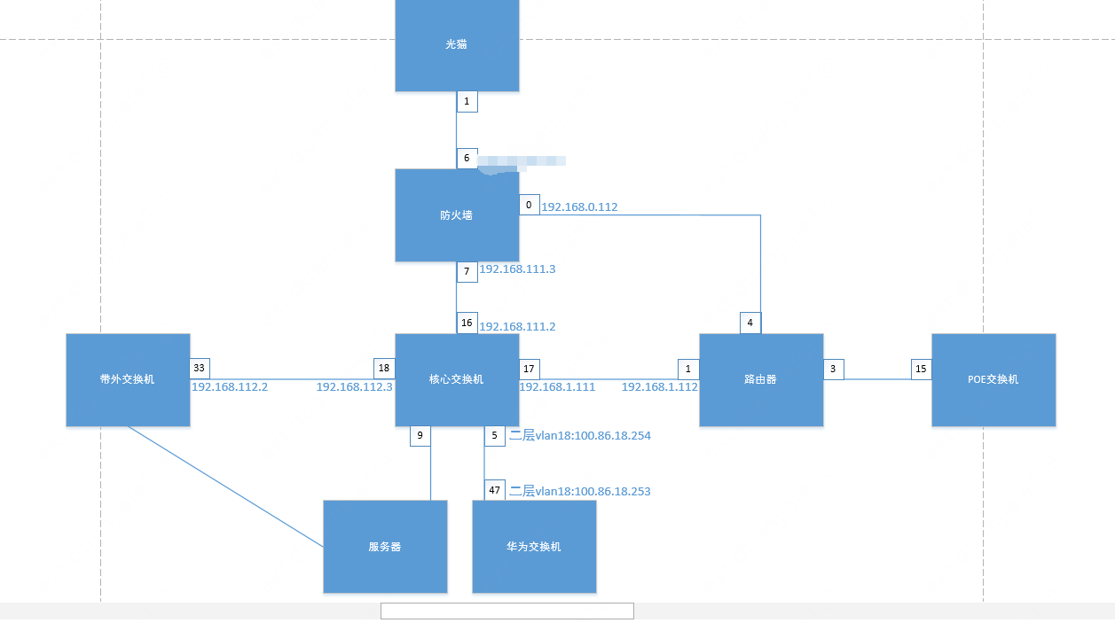 网络架构如图:华为交换机到核心是用的二层端口,做的trunk,然后能从华为交换机上ping通防火墙的7口192.168.111.3,但是却ping不通防火墙的6口,也就是公网ip所在的端口,求指教