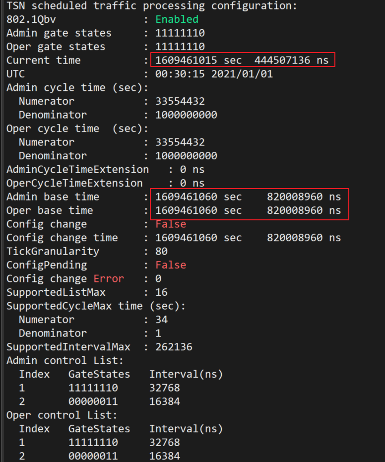 tsn qbv control-list index 1 gate-state 254 interval 32768 index 2 gate-state 1 interval 16384 tsn qbv gate-state 254